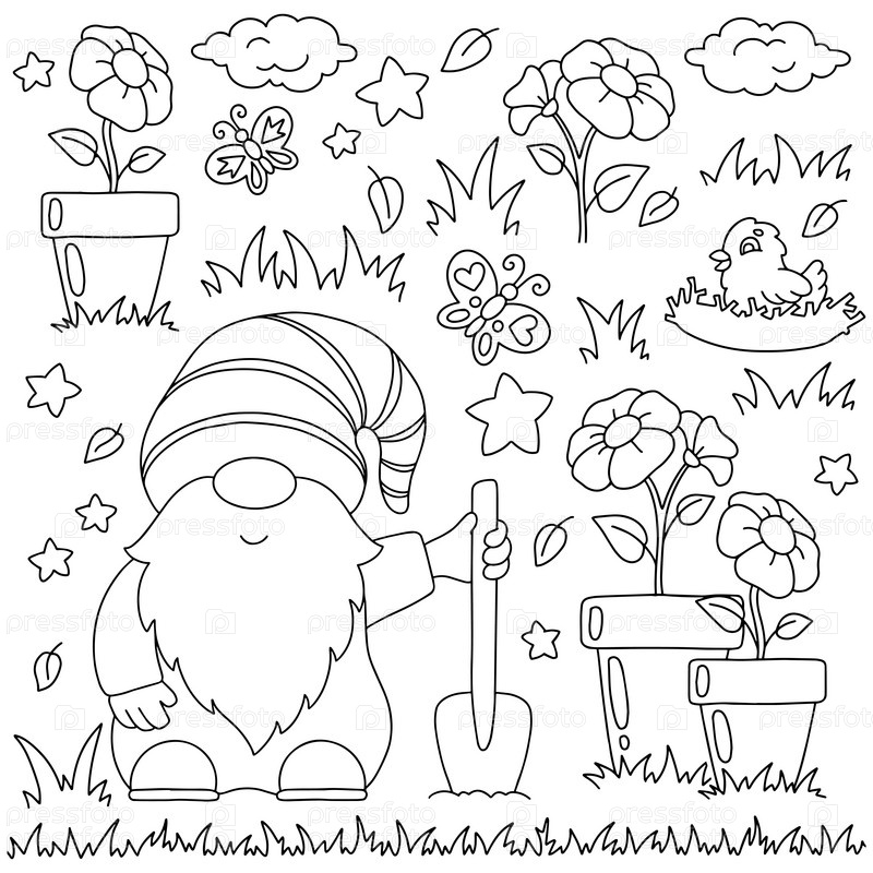Садовый гном с лопатой и цветами. Страница раскраски для детей. Персонаж в мультяшном стиле. Векторная иллюстрация на белом фоне