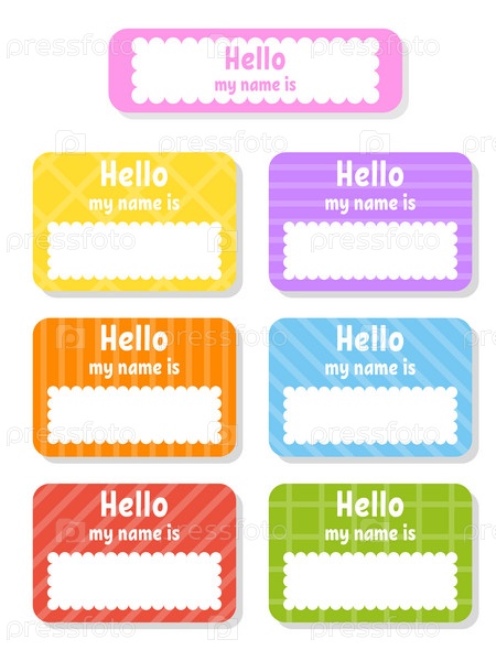 Привет, бейдж. Яркие наклейки. Прямоугольная этикетка. Цветная векторная изолированная иллюстрация