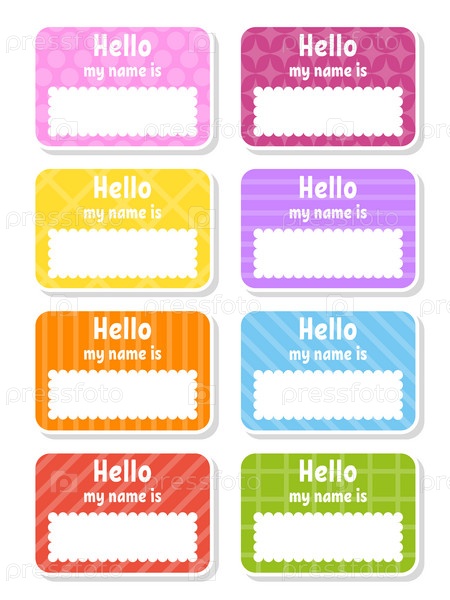 Привет, бейдж. Яркие наклейки. Прямоугольная этикетка. Цветная векторная изолированная иллюстрация
