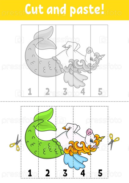 Изучаем цифры от 1 до 5. Вырезаем и склеиваем. Персонаж мультфильма. Развивающий рабочий лист для обучения. Игра для детей. Страница с заданиями. Цветная изолированная векторная иллюстрация