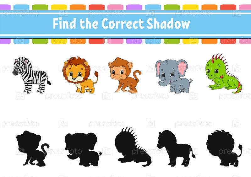 Найдите правильную тень. Образовательный развивающий рабочий лист. Игра на соответствие для детей. Страница с цветной активностью. Головоломка для детей. Милый персонаж. Векторная иллюстрация. Мультяшный стиль