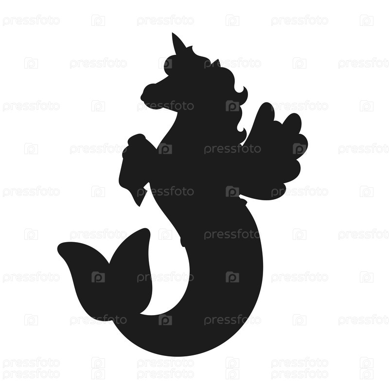 Черный силуэт. Милая русалка-единорог. Векторная иллюстрация на белом фоне. Элемент дизайна. Шаблон для вашего дизайна, книги, наклейки, плакаты, открытки, детская одежда