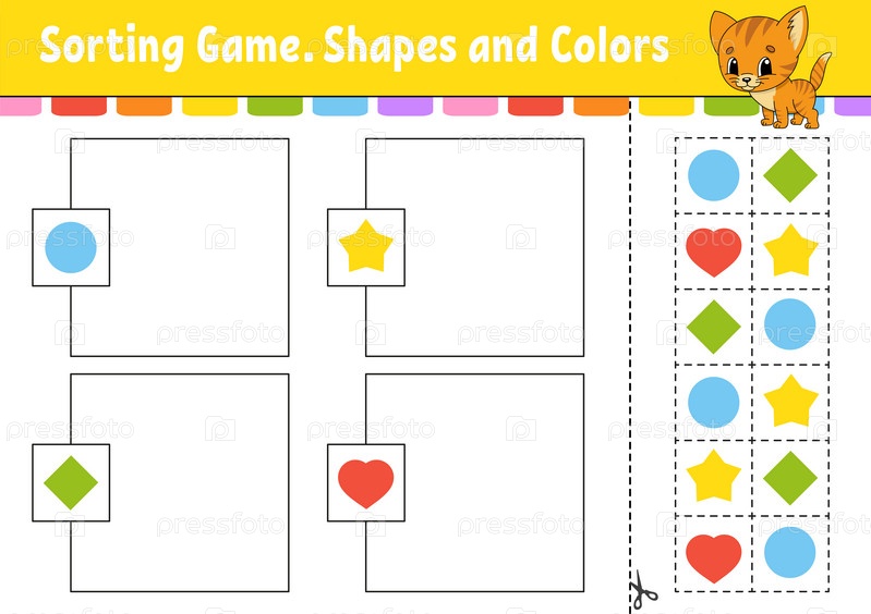 Игра на сортировку. Формы и цвета. Вырежи и склей. Образовательный развивающий рабочий лист. Игра для детей. Страница с цветной активностью. Головоломка для детей. Милый персонаж. Векторная иллюстрация. Мультяшный стиль