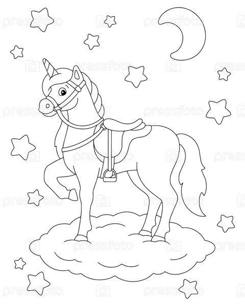 Красивый единорог стоит на облаке ночью. Страница раскраски для детей. Персонаж в мультяшном стиле. Векторная иллюстрация на белом фоне
