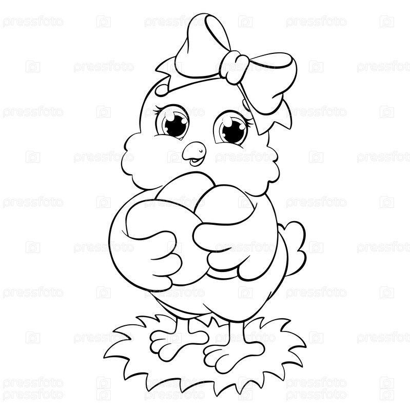 Милый цыпленок держит пасхальные яйца. Страница раскраски для детей. Персонаж в мультяшном стиле. Векторная иллюстрация на белом фоне