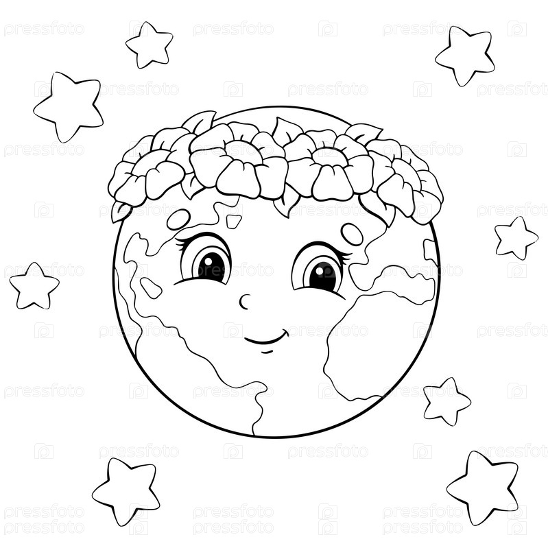 Планета Земля в венке из цветов. Раскраска для детей. Персонаж в мультяшном стиле. Векторная иллюстрация на белом фоне