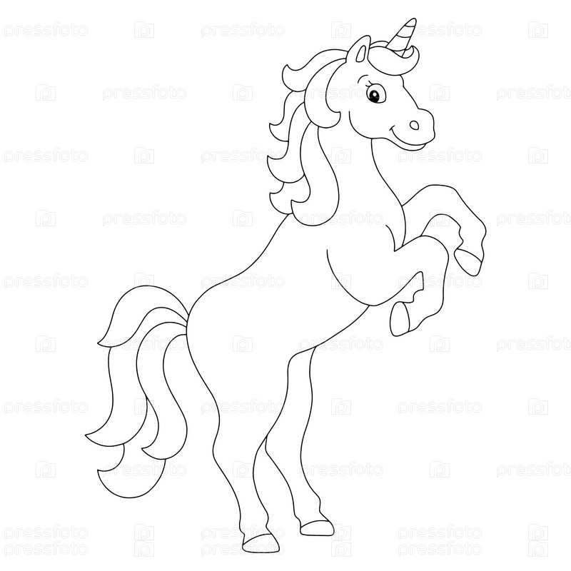 Волшебный единорог встал на дыбы. Страница раскраски для детей. Персонаж в мультяшном стиле. Векторная иллюстрация на белом фоне