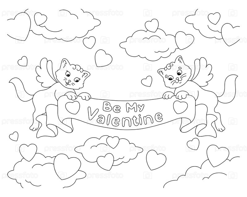 Коты с крыльями держат ленту с надписью. Страница раскраски для детей. День святого Валентина. Персонаж в мультяшном стиле. Векторная иллюстрация на белом фоне