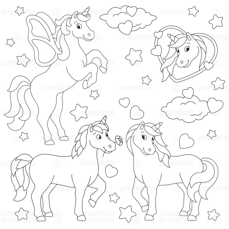 Прекрасные сказочные единороги в любви. Раскраска для детей. День святого Валентина. Персонаж в мультяшном стиле. Векторная иллюстрация на белом фоне