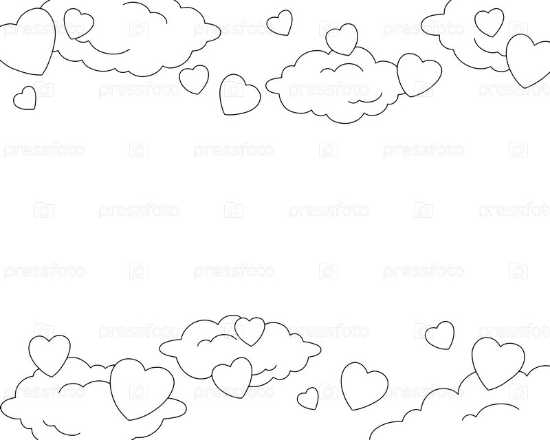 Сцена с облаками и сердцами. Страница раскраски для детей. День святого Валентина. Персонаж в мультяшном стиле. Векторная иллюстрация на белом фоне