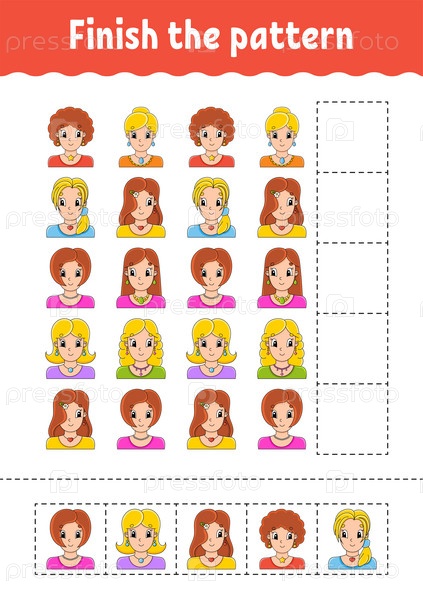 Закончите узор. Вырежьте и играйте. Образовательный развивающий рабочий лист. Страница с заданиями. Персонаж мультфильма. Векторная иллюстрация