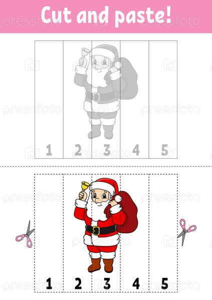 Изучаем цифры от 1 до 5. Вырезаем и склеиваем. Персонаж мультфильма. Развивающий рабочий лист. Игра для детей. Страница с заданиями. Векторная иллюстрация