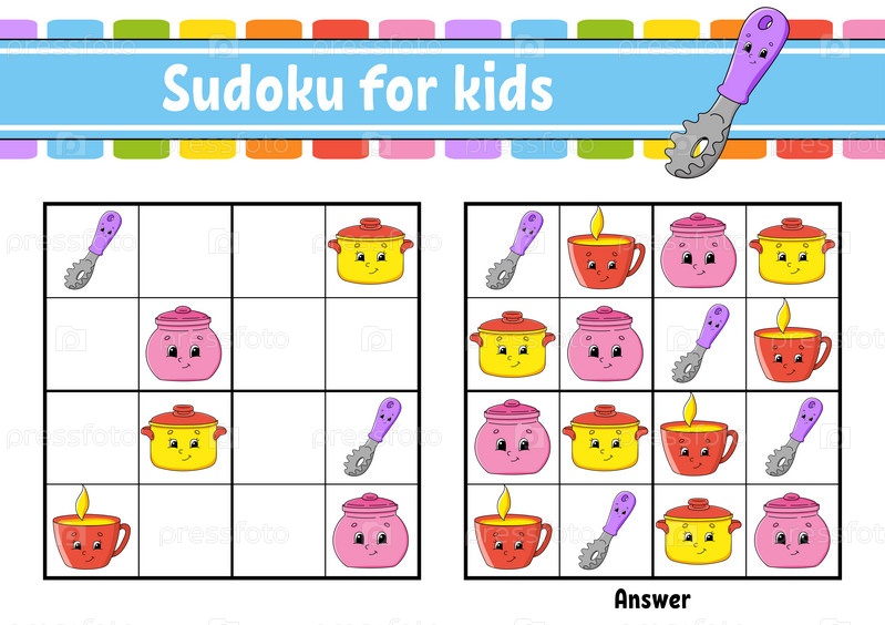 Тема посуды. Судоку для детей. Образовательный развивающий рабочий лист. Персонаж мультфильма. Цветная страница с заданиями. Игра-головоломка для детей. Тренировка логического мышления. Изолированная векторная иллюстрация