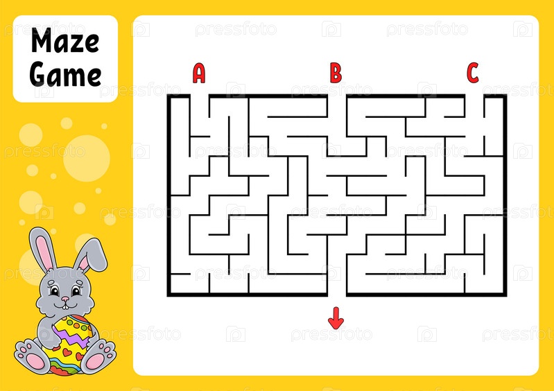 Прямоугольный лабиринт. Игра для детей. Три входа, один выход. Образовательный рабочий лист. Головоломка для детей. Загадка лабиринта. Цветная векторная иллюстрация. Найдите правильный путь. Пасхальная тема