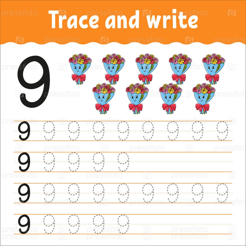 Изучайте цифры. Обводка и письмо. Практика письма. Образовательный развивающий рабочий лист. Цветная страница с заданиями. Изолированная векторная иллюстрация в милом мультяшном стиле