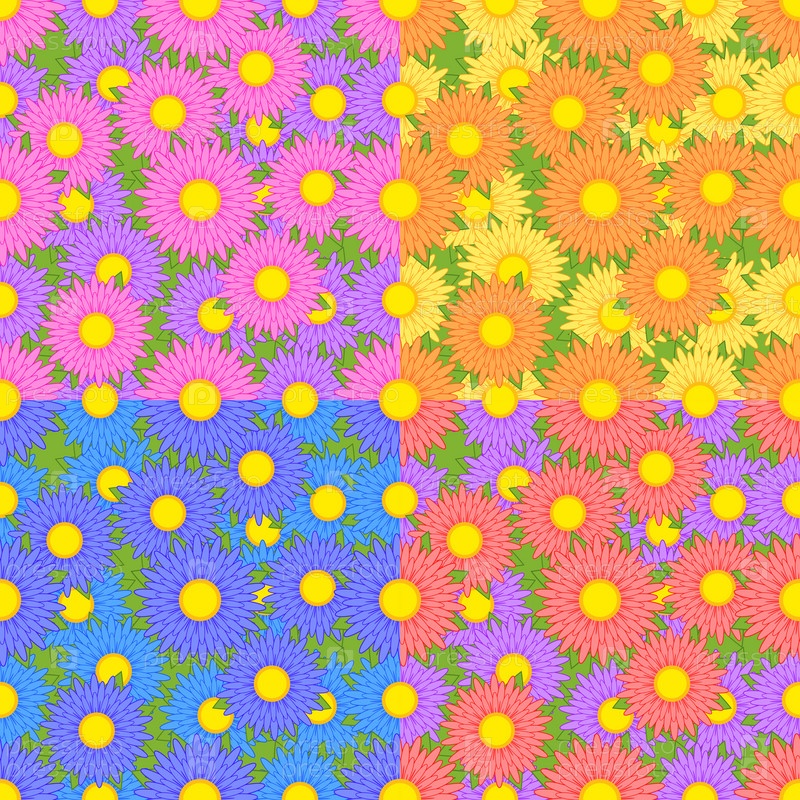 Набор бесшовных узоров из астр разных цветов: желтый, розовый, синий, оранжевый, фиолетовый
