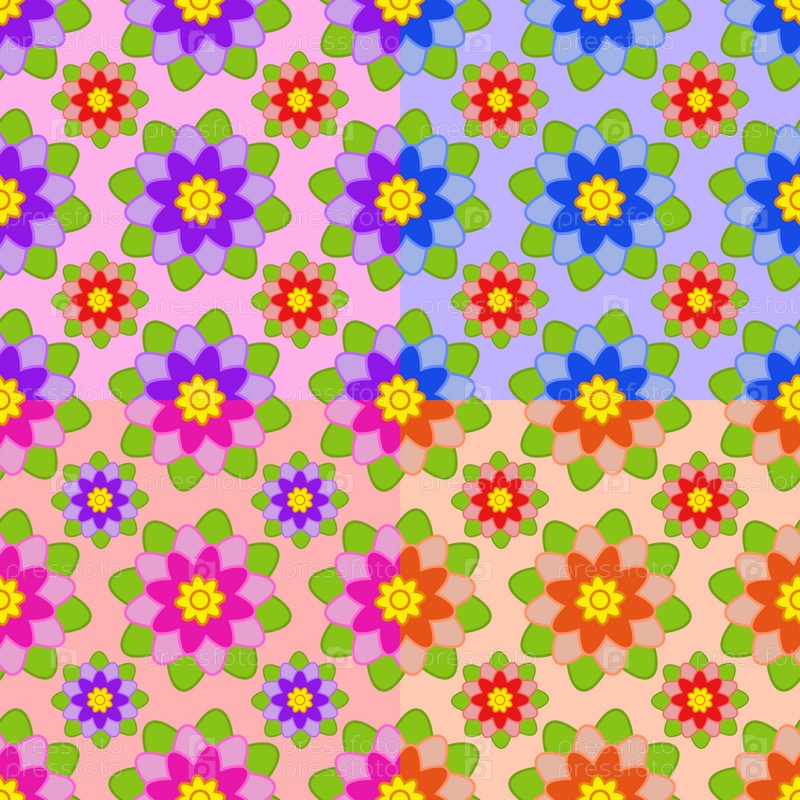 Набор бесшовных узоров из цветов разных цветов: розового, синего, оранжевого, фиолетового с зелеными листьями