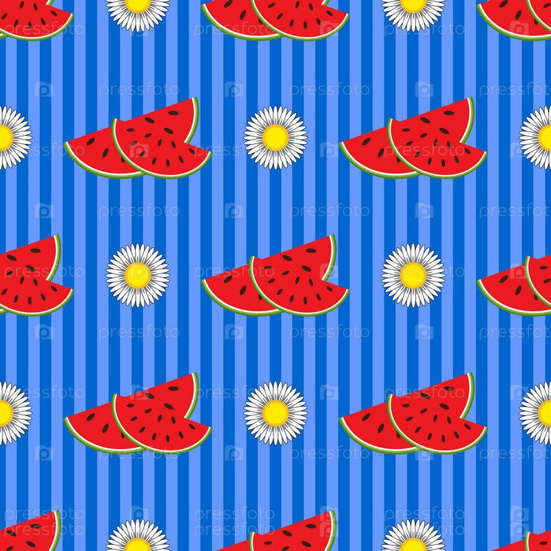 Бесшовный узор из аппетитных красных ломтиков арбуза и белых цветов на синем полосатом фоне