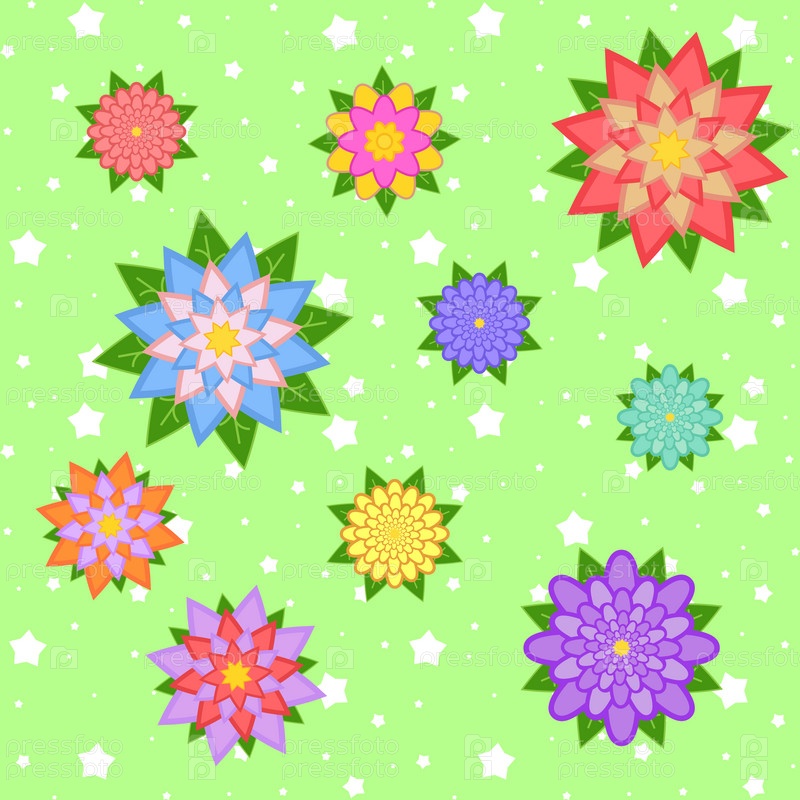 Набор красивых красочных цветов на зеленом звездном фоне. Десять вариантов. Подходит для дизайна