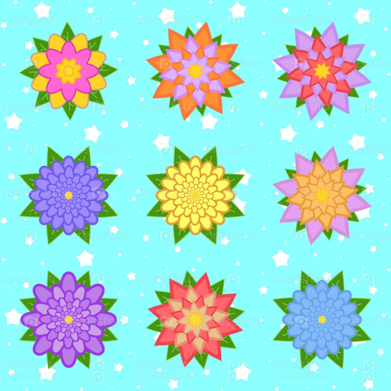 Набор красивых красочных цветов на синем звездном фоне. Девять вариантов. Подходит для дизайна