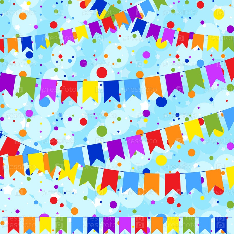 Набор из шести плоских цветных гирлянд, изолированных в виде флажков на веревке. На фоне красочного конфетти. Подходит для дизайна