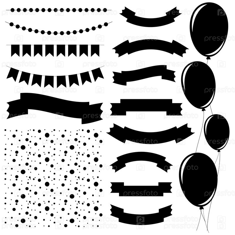 Набор плоских черных изолированных силуэтов воздушных шаров на веревках и гирлянды флагов. Набор лент баннеров разной формы. Фон в виде конфетти