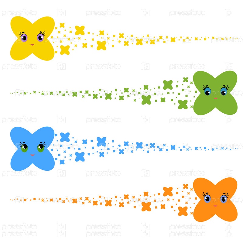 Набор плоских цветных изолированных звезд мультфильмов, летящих по небу. Забавные милые персонажи для украшения