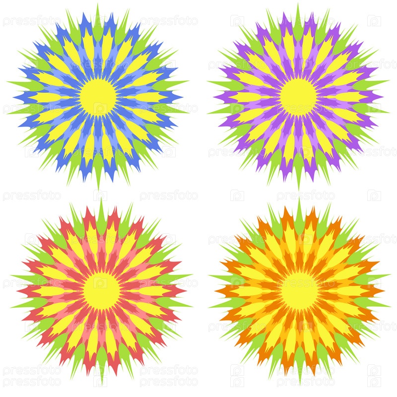 Набор плоских изолированных цветных желтых, красных, фиолетовых, синих абстрактных цветов на белом фоне. Простой дизайн для украшения