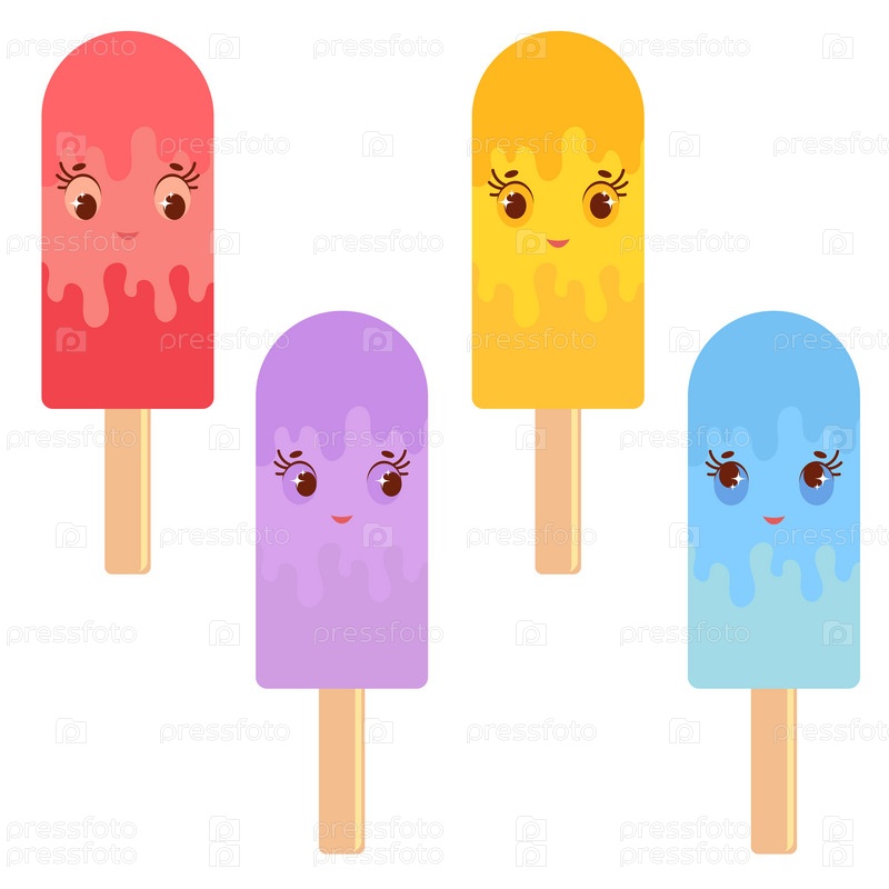 Набор плоского цветного изолированного мультяшного мороженого, политого оранжевой глазурью, розового, синего, фиолетового цветов. На деревянных палочках. Иллюстрация на белом фоне