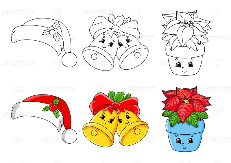 Набор раскрасок для детей. Милые персонажи мультфильмов. Черная обводка. С образцом. Яркие наклейки. Векторная иллюстрация