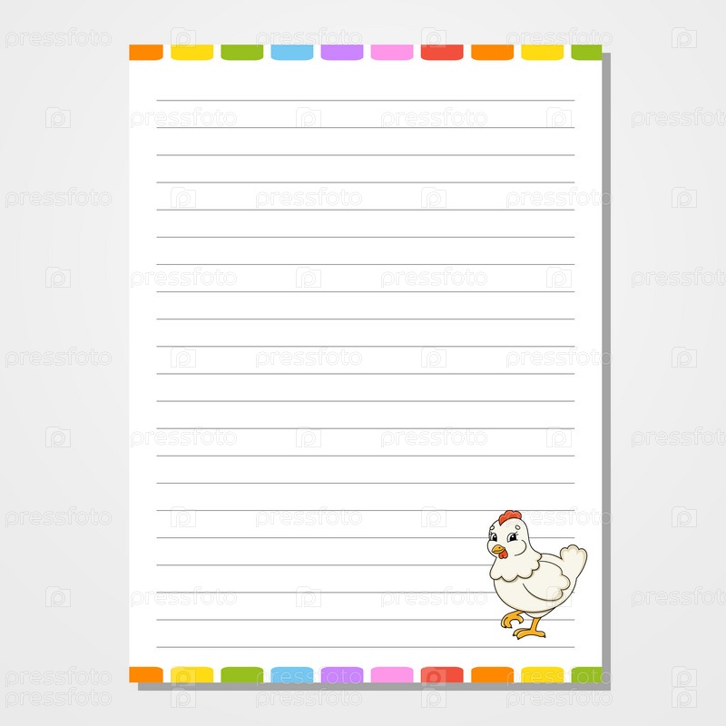 Шаблон листа для блокнота, записной книжки, дневника. Линованная бумага. Милый персонаж. С цветным изображением. Мультяшный стиль. Векторная иллюстрация