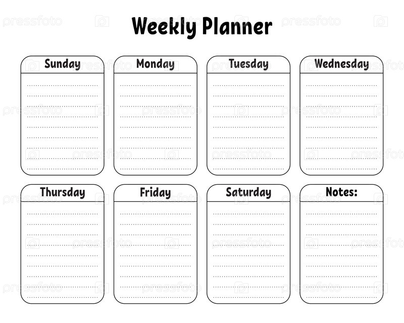Планировщик на неделю. Яркий красочный пустой шаблон для печати. Векторная иллюстрация