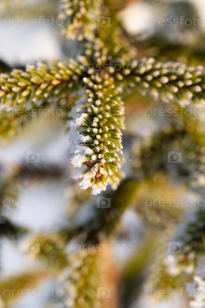 Ветви ели в городском парке, покрытые инеем
