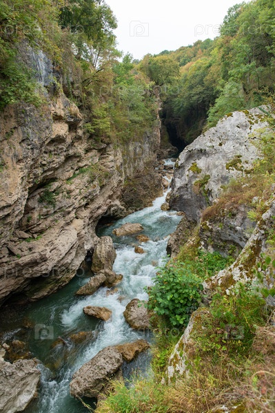Бурная горная река, протекающая в узком скалистом ущелье