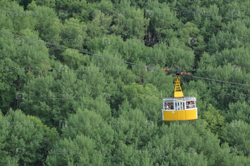 Желтый вагончик фуникулера пассажирской маятниковой безопорной канатной дороги в Курортном парке Кисловодска в летний день