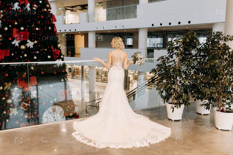 Красивая и сияющая невеста грациозно позирует в потрясающем свадебном платье перед праздничной рождественской елкой