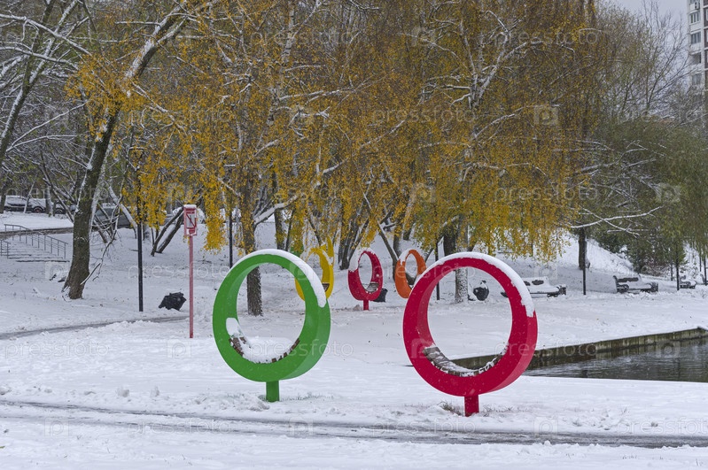Лавочки оригинальной круглой формы на берегу Малого Коньковского пруда. Улица Введенского, Предзимье, первый снег, пасмурный день в начале ноября