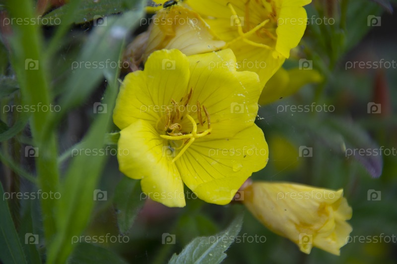 Красивый желтый цветок на фоне зеленых листьев. Ослинник Двулетний или Вечерняя Примула