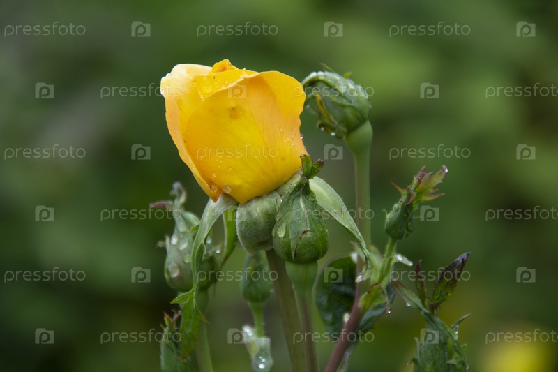 Желтый бутон розы на размытом зеленом фоне