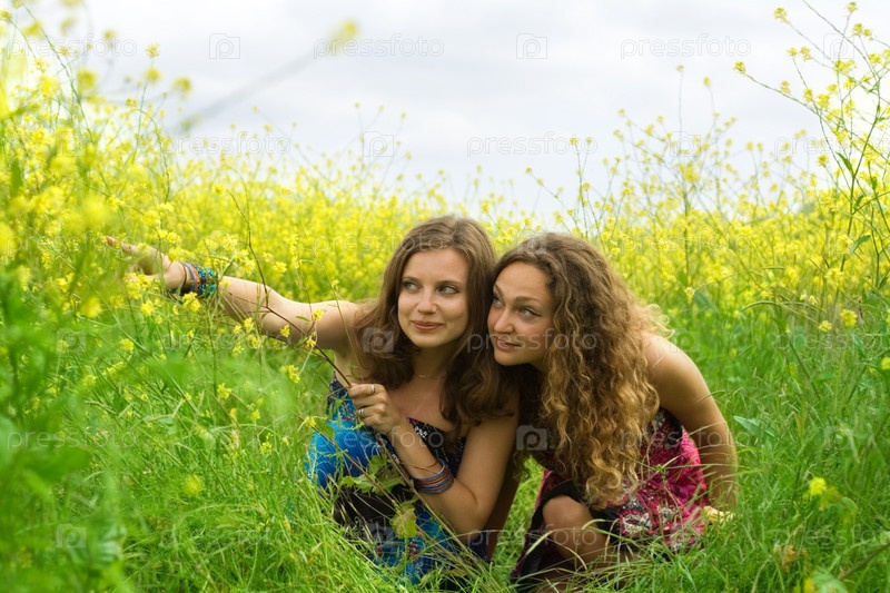 Две девушки на зеленом лугу