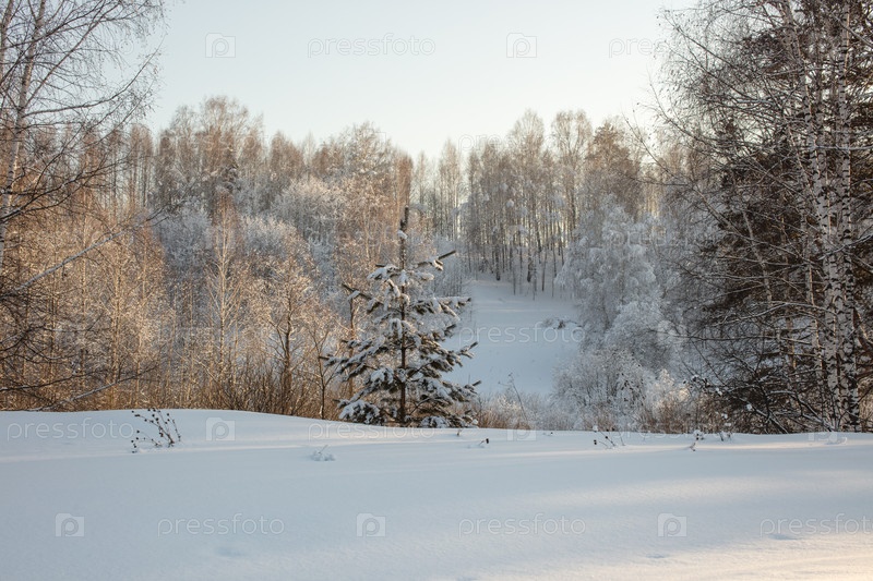 Снежная сибирская зима. Много снега и солнечно, морозно
