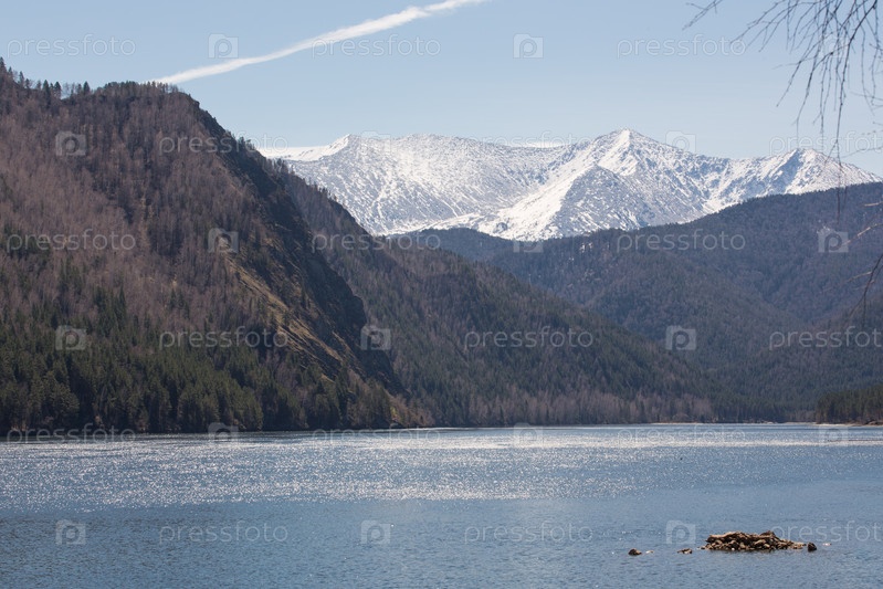 Красивый вид на реку Енисей, заснеженные горы и лес в ясный день
