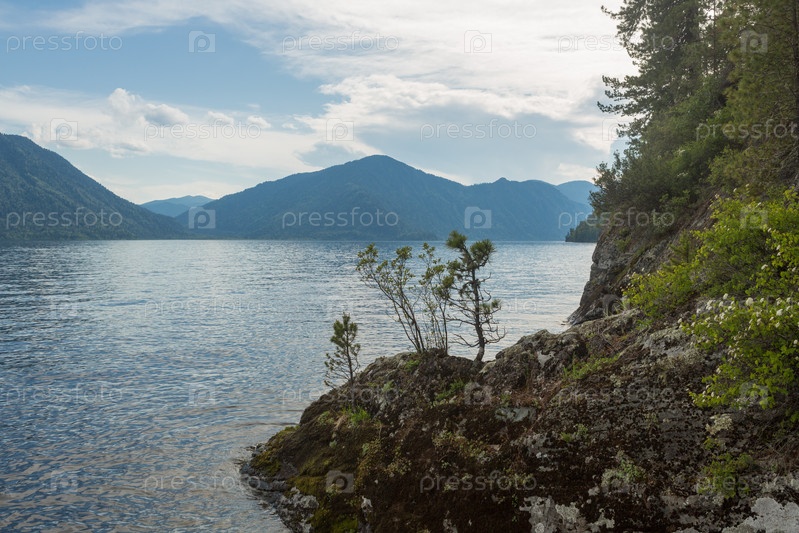 Телецкое озеро со спокойной водой в летний день. Алтайский край