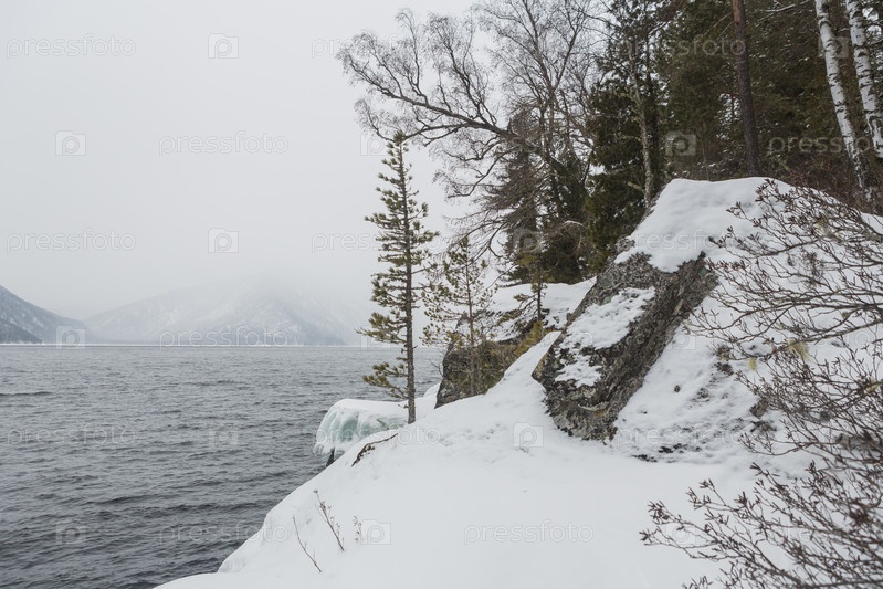 Незамерзающее Телецкое озеро зимой. Россия Алтайский край
