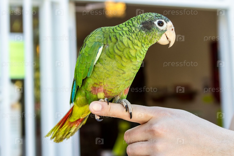 Зеленый попугай амазон сидит на руке