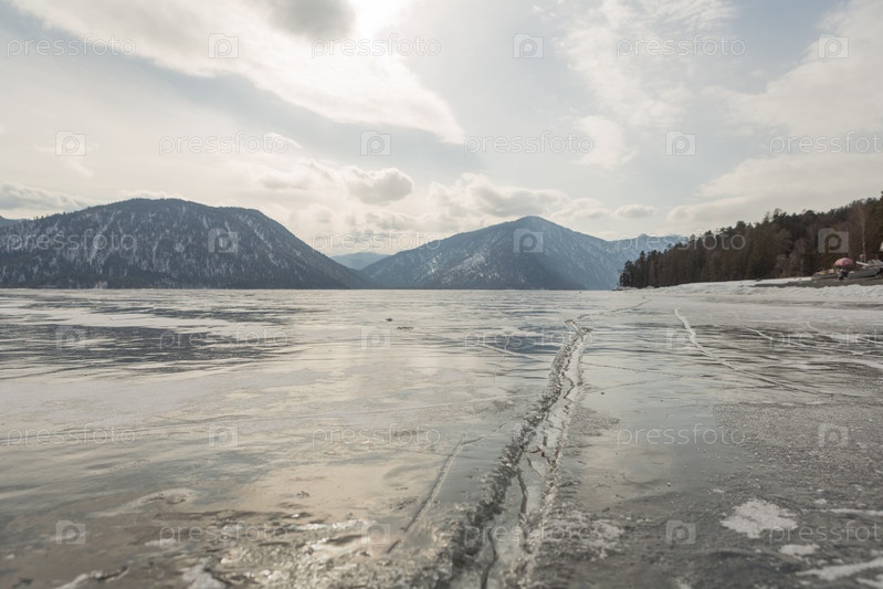 Вид на красивые рисунки на льду из трещин и пузырьков глубинного газа на поверхности Телецкого озера зимой, Россия