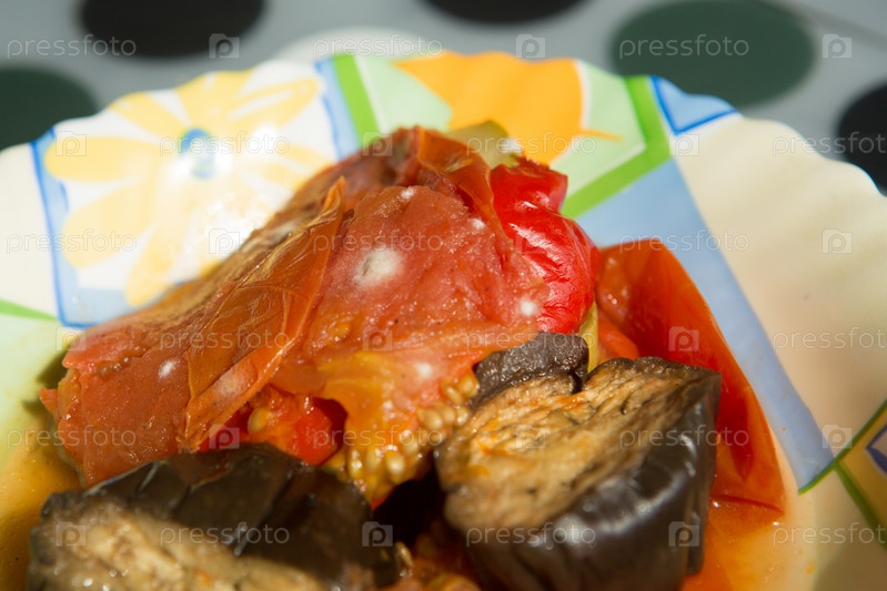 Плесень на тушеных овощах, испорченная еда крупным планом на тарелке