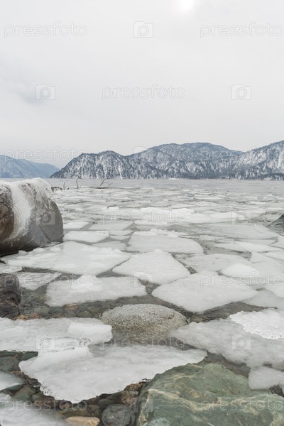 Незамерзающее Телецкое озеро зимой. Россия Алтайский край