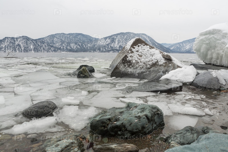 Незамерзающее Телецкое озеро зимой. Россия Алтайский край