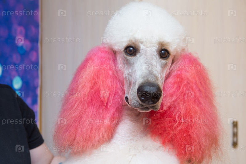 Ухоженный белый милый пудель с кудрявым мехом. Портрет морды крупным планом. Это самая умная порода собак